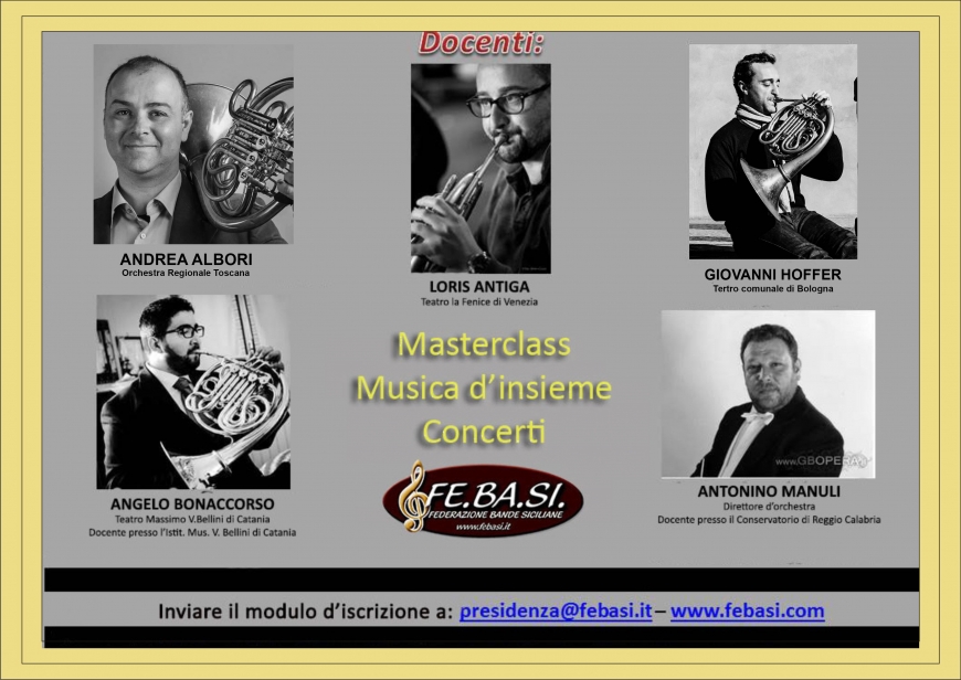 La FE.BA.SI. ( Federazione Bande Siciliane) dopo il grande successo della scorsa edizione, è lieta di presentarvi il 2° FESTIVAL CORNISTICO dell’ETNA. Nato dall’idea di stimolare i giovani cornisti all’approfondimento dello studio del corno con lezioni individuali e collettive di musica d’insieme.