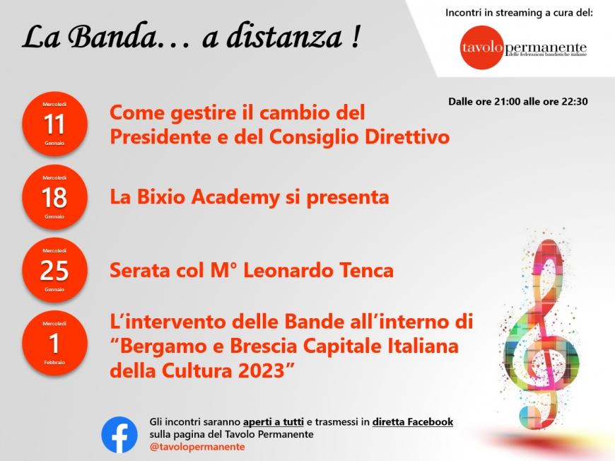 Siamo arrivati a Mercoledì 25 Gennaio e parleremo di Musica: “Serata col M° Leonardo Tenca”, un incontro col famoso Direttore, recentemente nominato Cavaliere della Repubblica. Sarà l’occasione di parlare anche della recente iniziativa “Music to play – il repertorio per Banda in pillole” che sta raccogliendo tanto interesse.