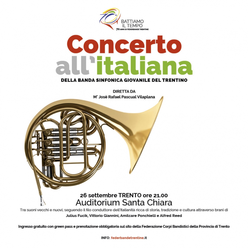 Prenotazioni e ulteriori informazioni al seguente link: https://www.federbandetrentine.it/dettaglio-evidenza/-/d/concerto-all-italiana