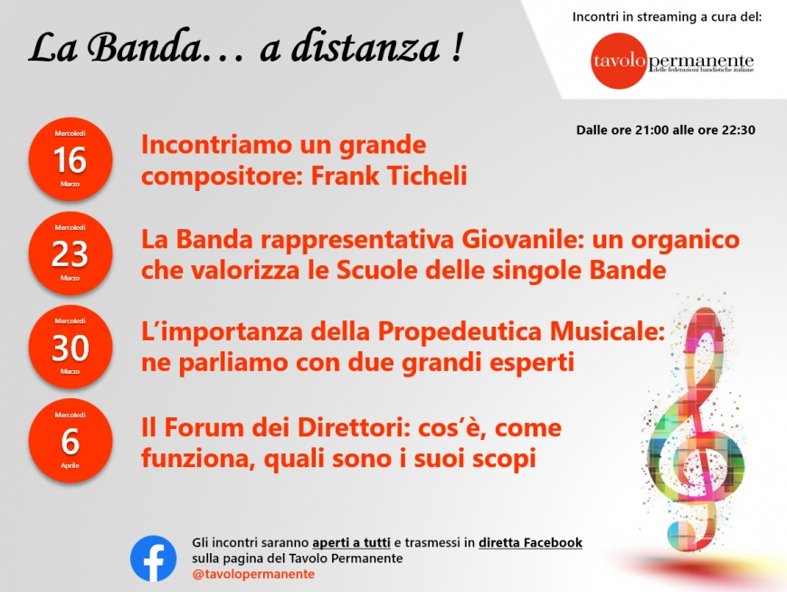 Mercoledì 23 Marzo, invece, tratteremo un interessantissimo argomento: “La Banda rappresentativa Giovanile: un organico che valorizza le Scuole delle singole Bande”.