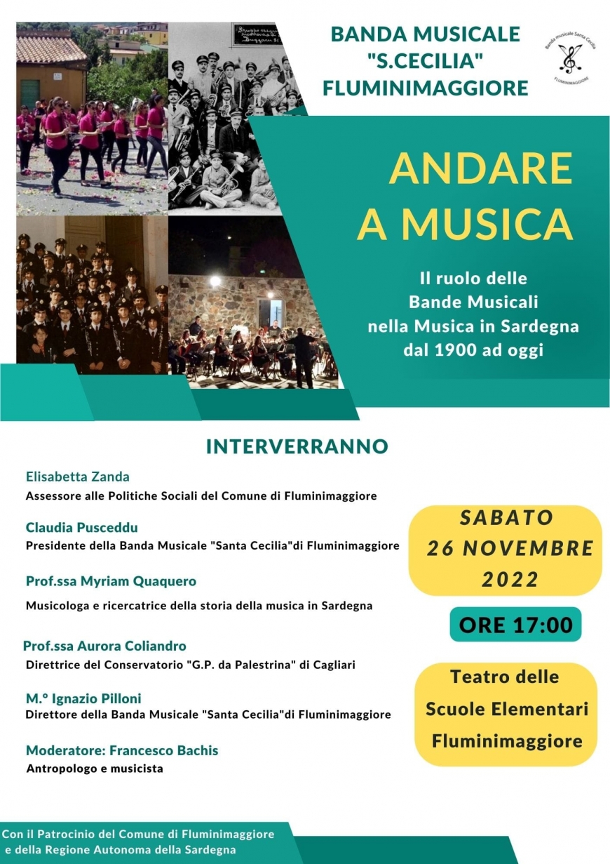 Si terrà a Fluminimaggiore (SU) un importante convegno nella giornata di Sabato 26 Novembre 2022, con inizio alle ore 17,00 presso il Teatro delle Scuole Elementari, dal tema “Il ruolo delle Bande Musicali nella musica in Sardegna dal 1900 ad oggi”.