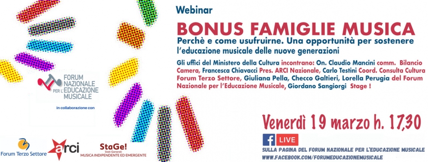 Il “Forum Nazionale per l’Educazione Musicale”, di cui il TP fa parte, organizza un appuntamento sul Bonus Musica per Venerdì 19 alle 17,30.