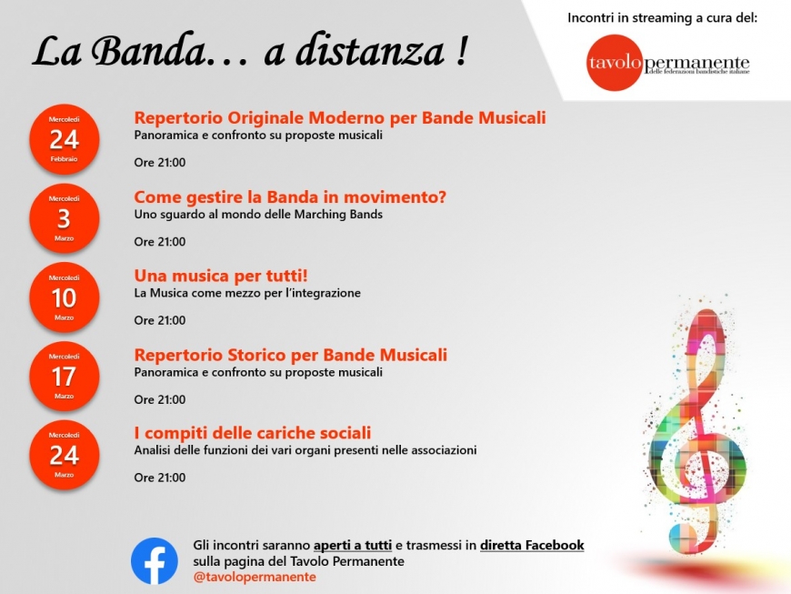 Dopo una brevissima pausa di una settimana, riprenderà “LA BANDA… A DISTANZA” con un terzo blocco di incontri interessantissimi e sempre inerenti gli aspetti inerenti la Banda Musicale.