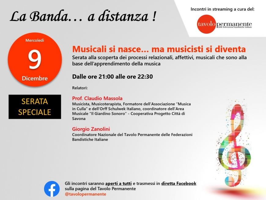 L’argomento che verrà trattato, relativamente poco conosciuto nel nostro Paese, merita sicuramente di essere preso in considerazione dalle nostre Associazioni, e rappresenta quasi una sorta di “nuova frontiera” per le Bande in un futuro assai prossimo: la scoperta dei processi relazionali, affettivi e musicali che sono alla base dell’apprendimento stesso della Musica, soprattutto nella fascia d’età 0 – 6 anni, è una sfida che dovremo sicuramente raccogliere.