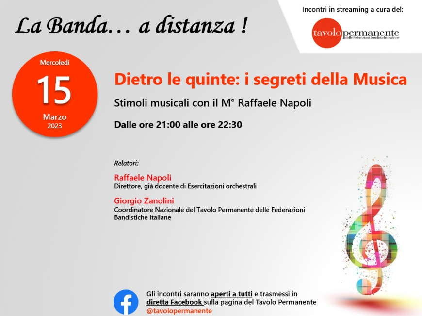 “DIETRO LE QUINTE: I SEGRETI DELLA MUSICA”: questo il titolo dell’incontro di Mercoledì 15 Marzo 2023, che riporta anche il sottotitolo “Stimoli musicali con il M° Raffaele Napoli “. Un affascinante viaggio in cui saremo accompagnati e… ma non vogliamo fare anticipazioni: è una serata tutta da gustare ! Vi aspettiamo, quindi, sempre alle ore 21,00 e sempre in diretta sulla pagina FB o sul canale Youtube del TP. E se non potete essere presenti in diretta ricordiamo che potete rivedere comodamente i filmati quando volete !
