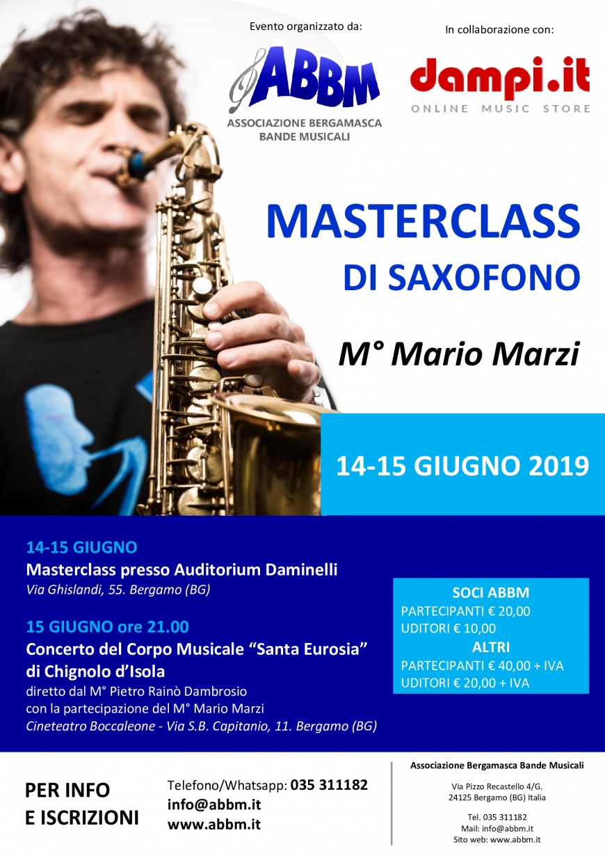 ABBM – Associazione Bergamasca Bande Musicali con la collaborazione di Daminelli Strumenti Musicali organizza per i giorni venerdì 14 e sabato 15 giugno 2019 la Masterclass di Saxofono con il M° Mario Marzi.