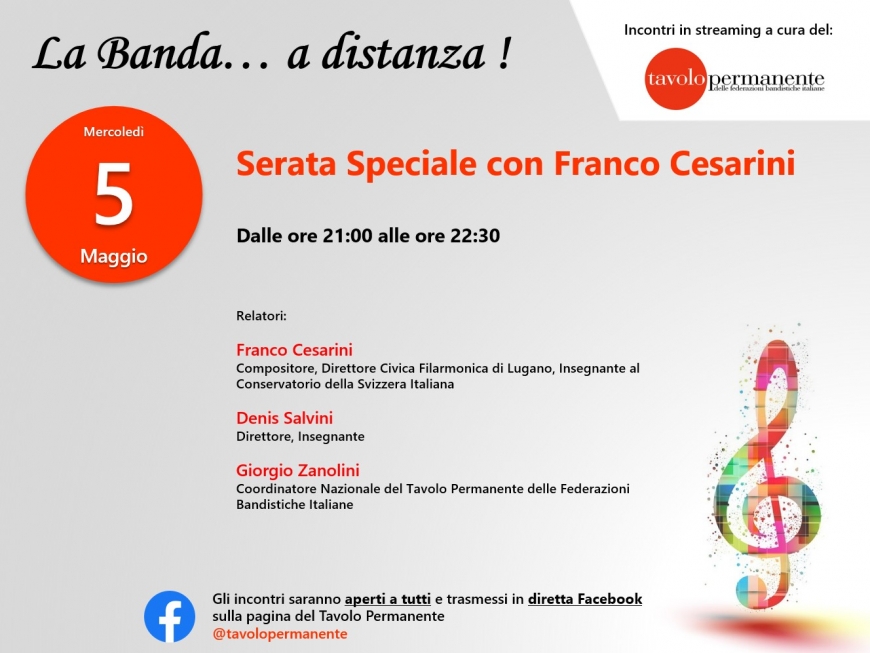 Serata speciale a conclusione degli appuntamenti seguitissimi de “La Banda… a distanza !” : è di nuovo con noi il un grande interprete a livello mondiale, il famosissimo Direttore e Compositore Franco Cesarini, Docente del Conservatorio di Lugano.