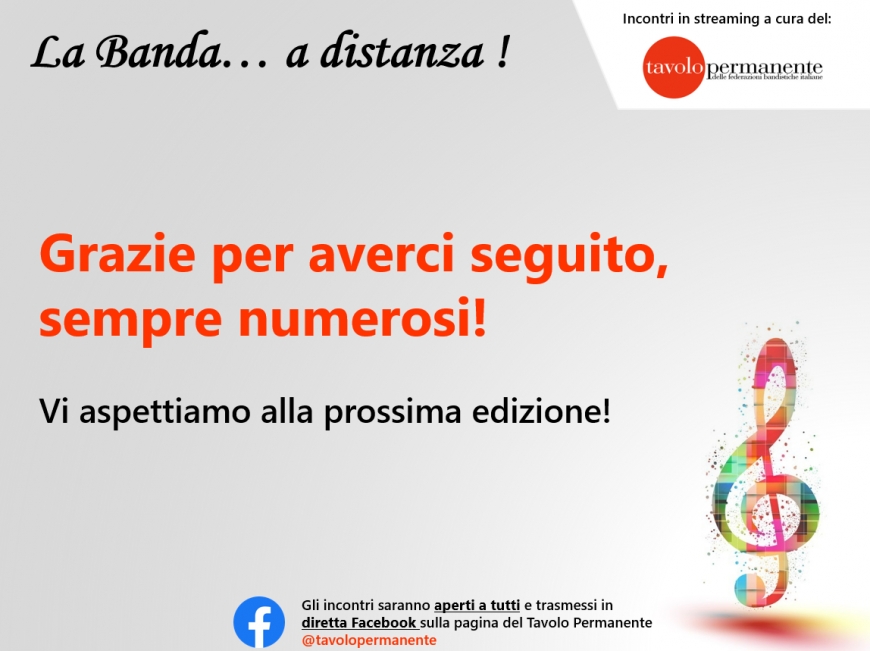 È terminata la quarta edizione de “La Banda… a distanza!”: grazie per averci seguito sempre numerosissimi, con molto interesse e manifestandoci il Vostro apprezzamento.